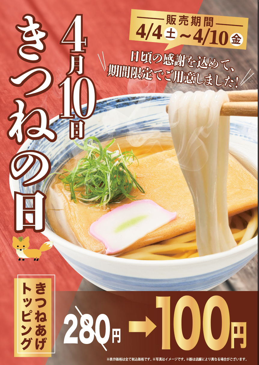 4月10日はきつねの日です。 トッピングきつね揚げ¥280→¥100で販売致しま