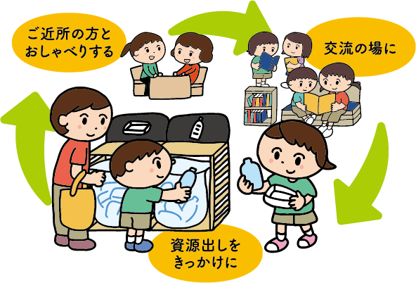 資源出しをきっかけに知り合いが増えたり、 近所の人とおしゃべりしたり、 地域交流の場にもどんどん利用してね。
