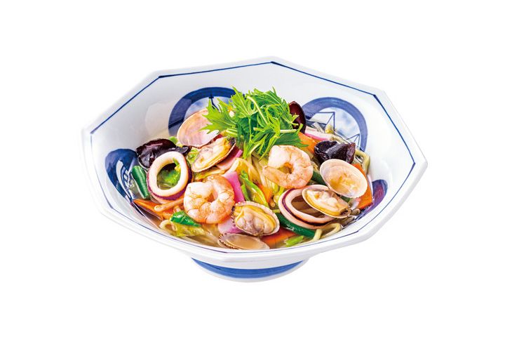国産野菜をたっぷり使用したちゃんぽんにイカ、エビ、あさりをトッピングしました。スープはあさりや魚介の旨みが凝縮された「あさり塩スープ」を使用し、生姜とあごだしがアクセントになったすっきりとした旨みを感じられる、1杯になっています。